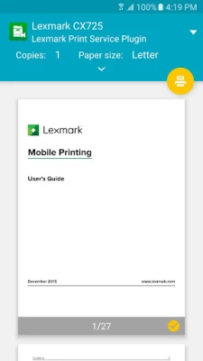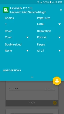 The Lexmark print service plugin enables native printing from your Android device to supported Lexmark products without requiring a 3rd party app. Documents and images can be easily printed directly to Lexmark printers on the same network as the Android Device. Familiar printing controls such as paper size, color, orientation, and number of copies are available. Because discovering a printer on an enterprise network can be challenging, features such as QR code scanning are provided to simplify manually adding a printer. For enterprise scalability and security, the Lexmark print service plugin also supports printing to a Lexmark Print Management Server.