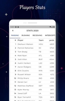 ✓ NFL Player Stats for the ongoing season.