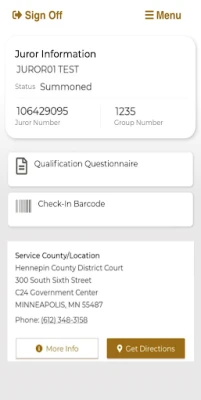 Jury service is easier with the My Minnesota Juror app from the Minnesota Judicial Branch. Download the app once you receive your summons, then simply log in, find your service location, and present your juror check-in barcode when you arrive at the courthouse.
