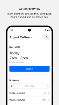 Square Team app is the one place for your team to communicate, manage schedules, access timecards, and stay in sync — all on the go. It also allows them to see their hours worked, breaks, overtime, and estimated pay.